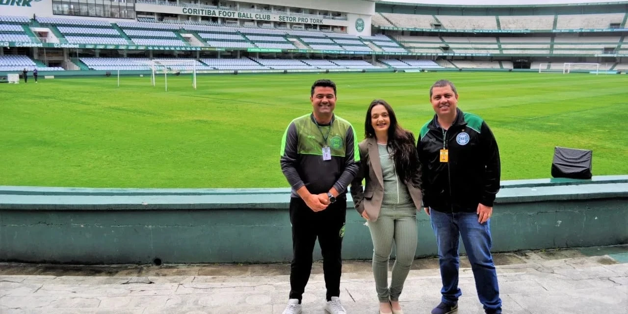 COM ASSESSORIAS - A chefe da Divisão de Esportes, Kessi Iarosz e o coordenador de jogos da Secretaria Municipal de Cultura Esportes e Recreação (SMCER), Samuel Carneiro, estiveram na terça-feira (18), na capital do estado, Curitiba, em visita ao Coritiba Foot Ball Club, para conhecer a estrutura da Escola Coxa.