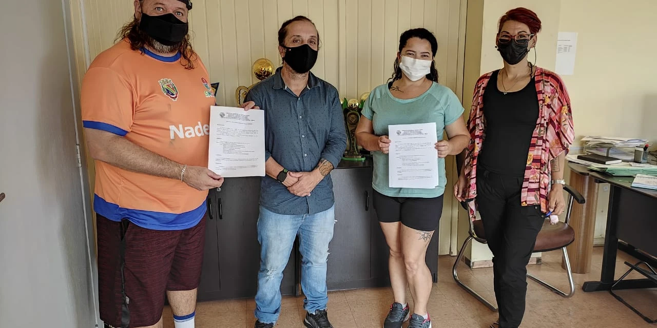 COM ASSESSORIAS - O coordenador do NADEPAR - Núcleo de Atividades e Desenvolvimento do Paradesporto, Anderson Wendt (Bello) e a professora do projeto, Silvana Dias Moreira e o secretário de Cultura, Esportes e Recreação, Fabrício Flores receberam, no dia 25/02, na Secretaria de Municipal Esporte e Recreação a professora Edna Ferreira da Silva, coordenadora do CMEJA – Centro Municipal de Educação de Jovens e adultos da Secretaria Municipal de Educação.