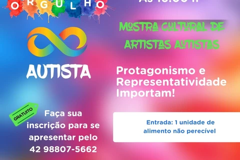 COM ASSESSORIAS - A ONDA – Organização Neurodiversa pelos Direitos dos Autistas e a Prefeitura de Telêmaco Borba, por meio das secretarias municipais de Educação e de Cultura, promovem no próximo domingo (18), às 16h, no Teatro Maestro Sirinho, do Centro Cultural Eloah Martins Quadrado (Casa da Cultura), a Mostra Cultural de Artistas Autistas.