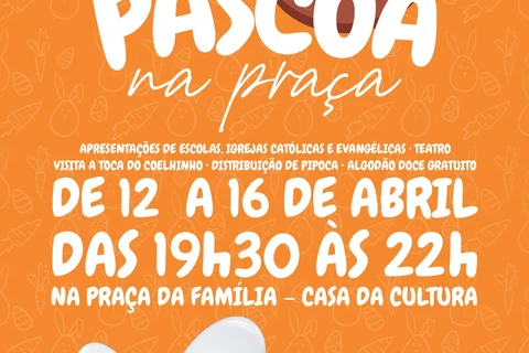 COM ASSESSORIAS - A Prefeitura de Telêmaco Borba realiza de 12 a 16 de abril a Páscoa na Praça. A atividade, organizada pela Secretaria Geral de Gabinete e pela Assessoria Turismo e Eventos, será na Praça da Família, sempre no horário das 19h30 às 22 horas.