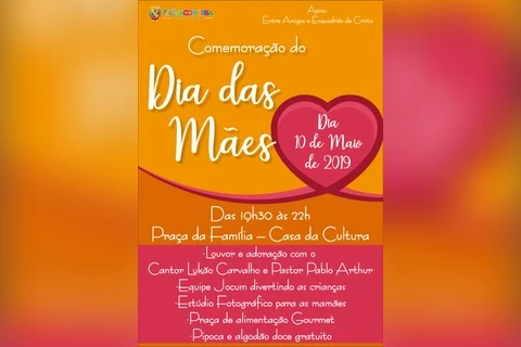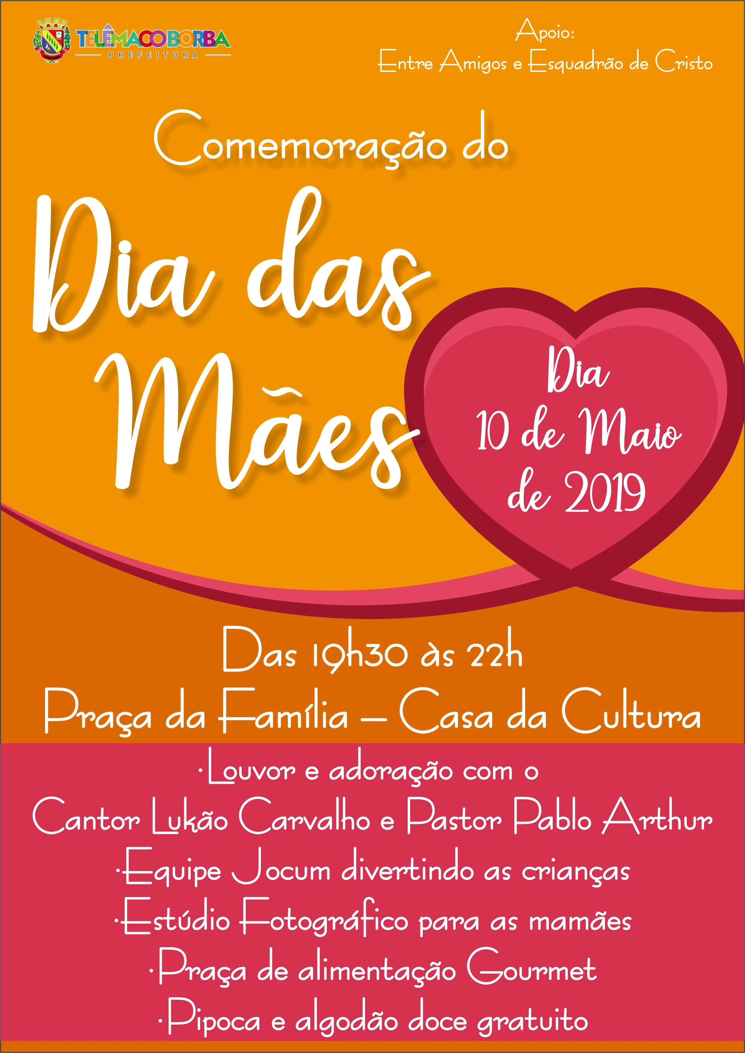 IMPRENSA/Telêmaco Borba - A Prefeitura em parceria com o Entre Amigos e o Esquadrão de Cristo promovem no dia 10 de maio, a partir das 19h30, na Praça da Família, ao lado do Centro Cultural Eloah Martins Quadrado (Casa da Cultura) uma programação especial em Comemoração ao Dia das Mães.