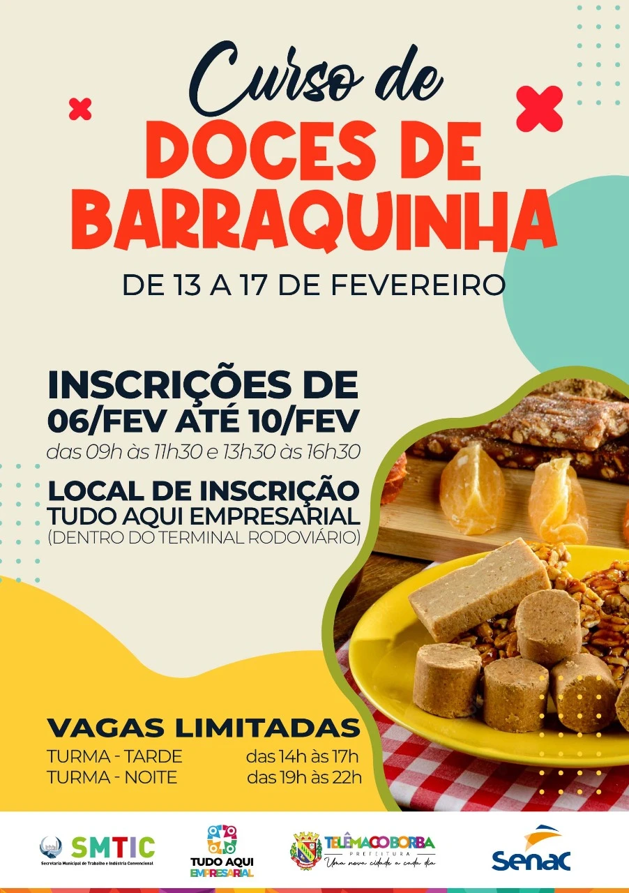COM ASSESSORIAS - A Prefeitura de Telêmaco Borba, por meio da Secretaria Municipal do Trabalho e da Indústria Convencional (SMITC), estará com inscrições abertas, de 06 a 10 de fevereiro, para o curso Doces de Barraquinha.