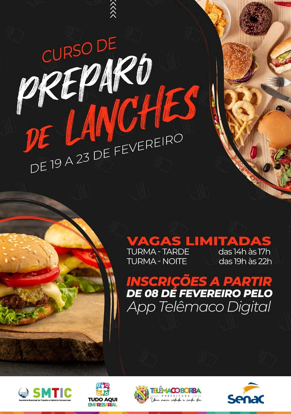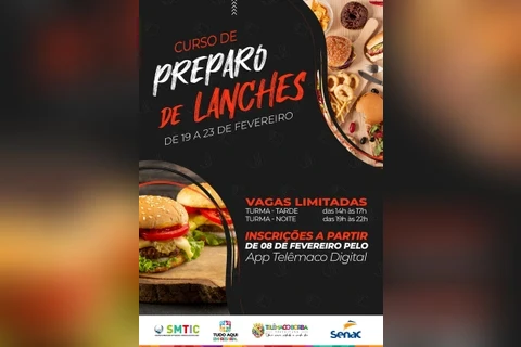COM ASSESSORIAS - A Prefeitura de Telêmaco Borba, por meio da Secretaria Municipal do Trabalho e Indústria e o Tudo Aqui Empresarial, anuncia a abertura de inscrições, a partir desta quinta-feira (08), para o curso de Preparo de Lanches, em parceria com o SENAC. Com o intuito de proporcionar capacitação e oportunidades aos munícipes, o curso oferecerá 36 vagas, divididas igualmente entre os períodos da tarde e da noite.