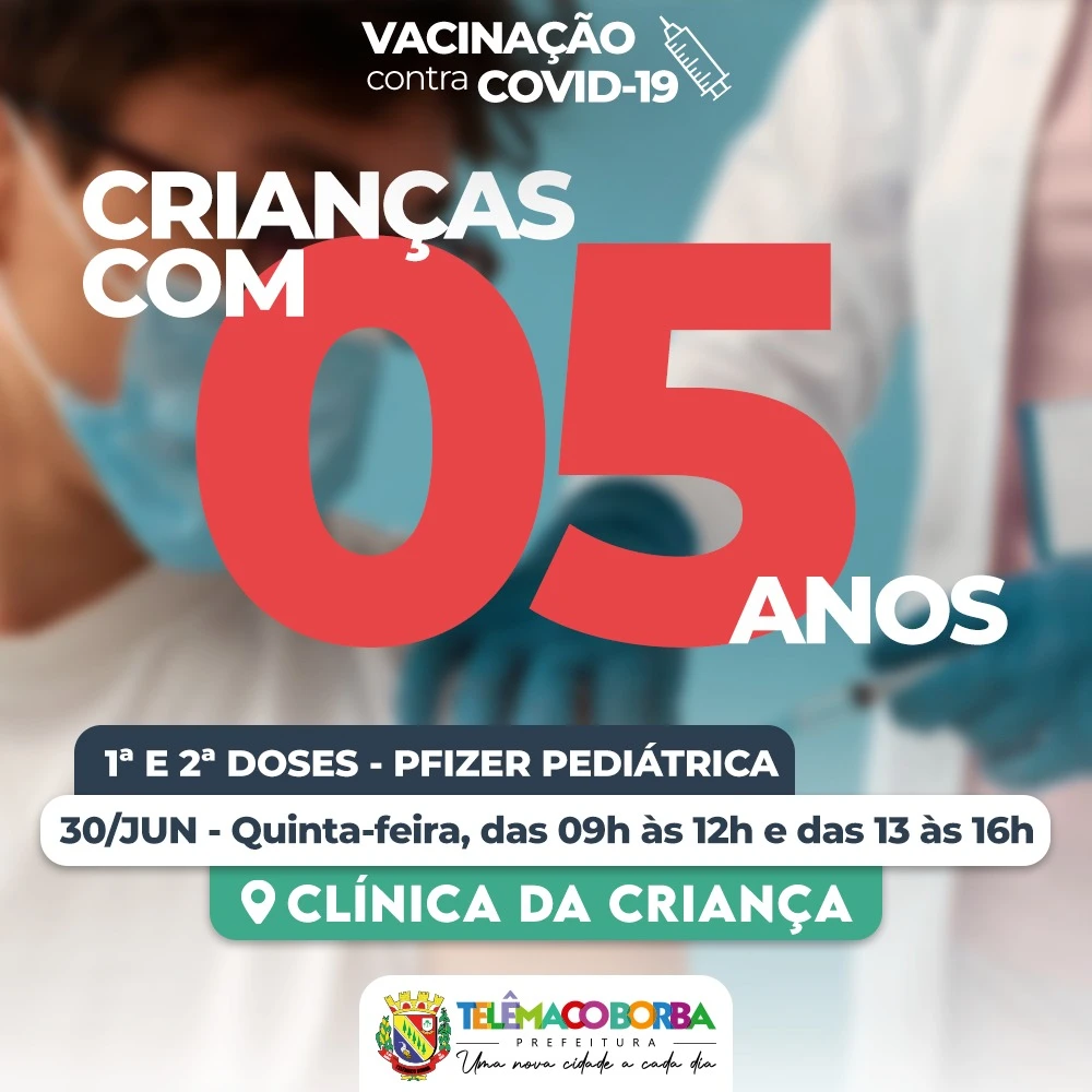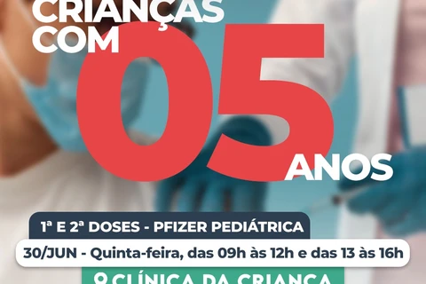 COM ASSESSORIAS - A Secretaria Municipal de Saúde (SMS) comunica que nesta quinta-feira (30), das 9 às 12 horas e das 13 às 16 horas será feita a Pfizer Pediátrica para crianças de 5 anos e segundas doses pendentes.