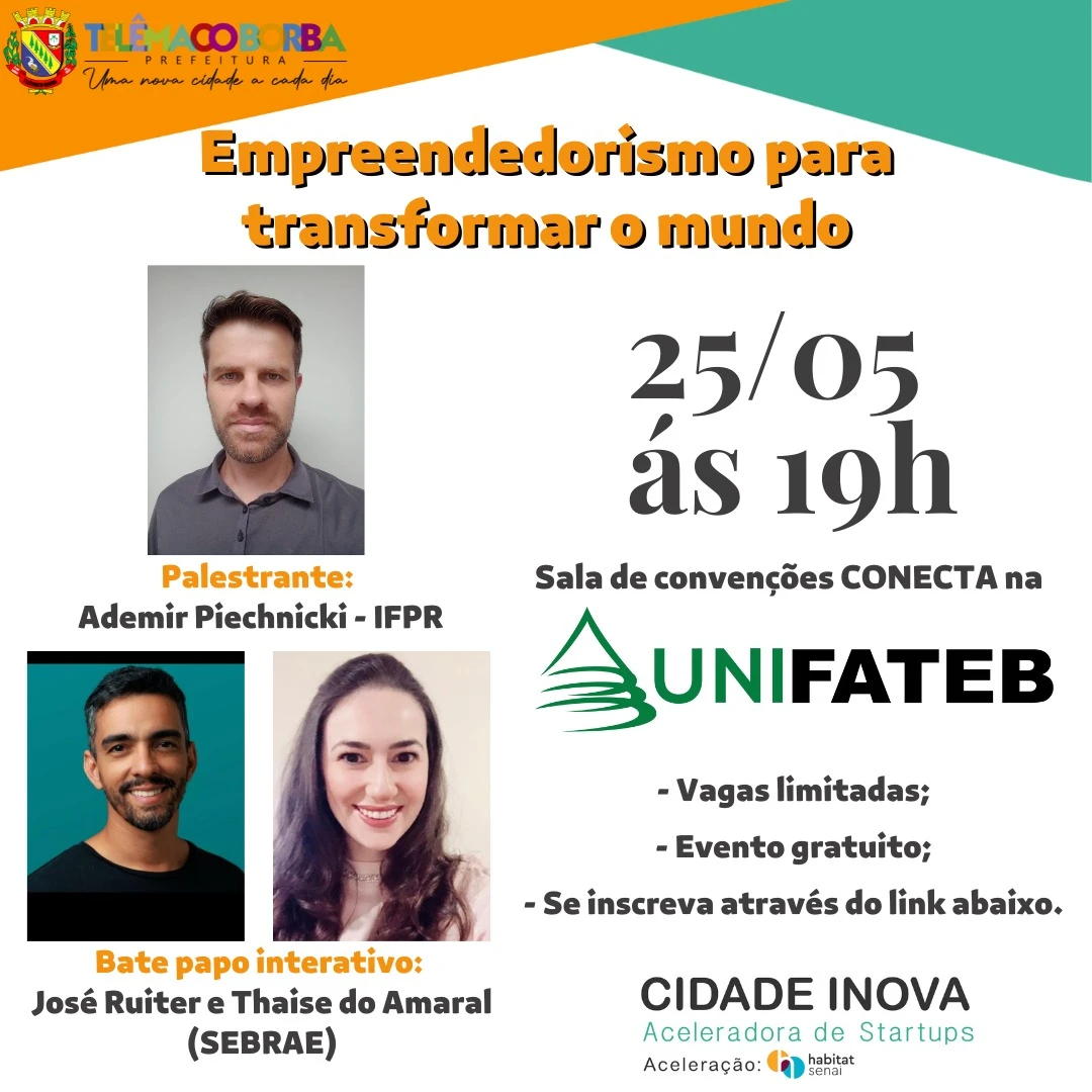 E como forma de fomentar esse processo, o Programa Cidade Inova – Aceleradora de Startup estará promovendo, no dia 25 de maio, uma palestra sob o tema “Empreendedorismo transformando o mundo”.