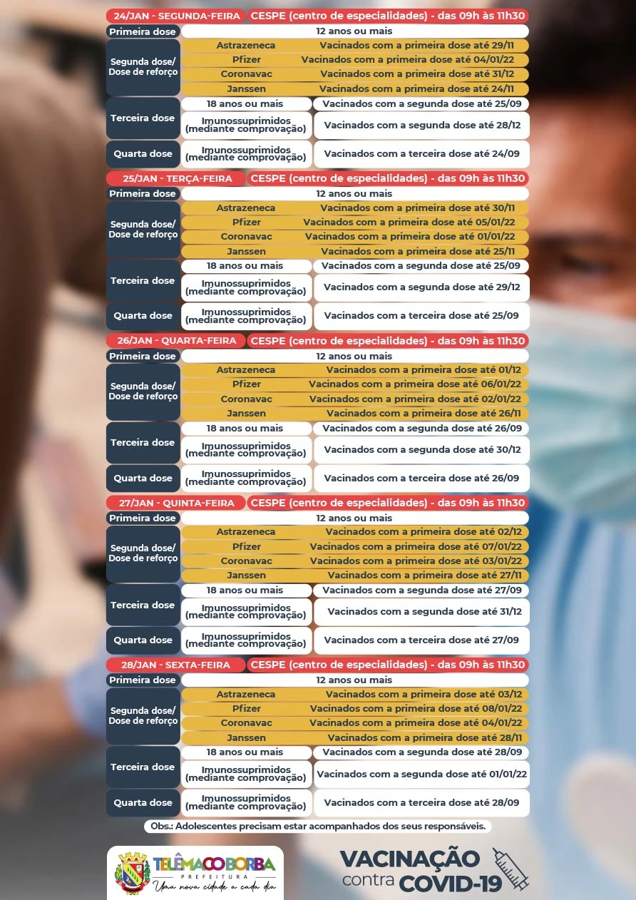Na segunda-feira (24) será feita a primeira dose para as pessoas com 12 anos ou mais e segunda dose da AstraZeneca para quem tomou a vacina com a primeira dose até 29 de novembro, primeira dose da Pfizer até dia 04 de janeiro e da CoronaVac para pessoas que foram vacinadas até 31 de dezembro.