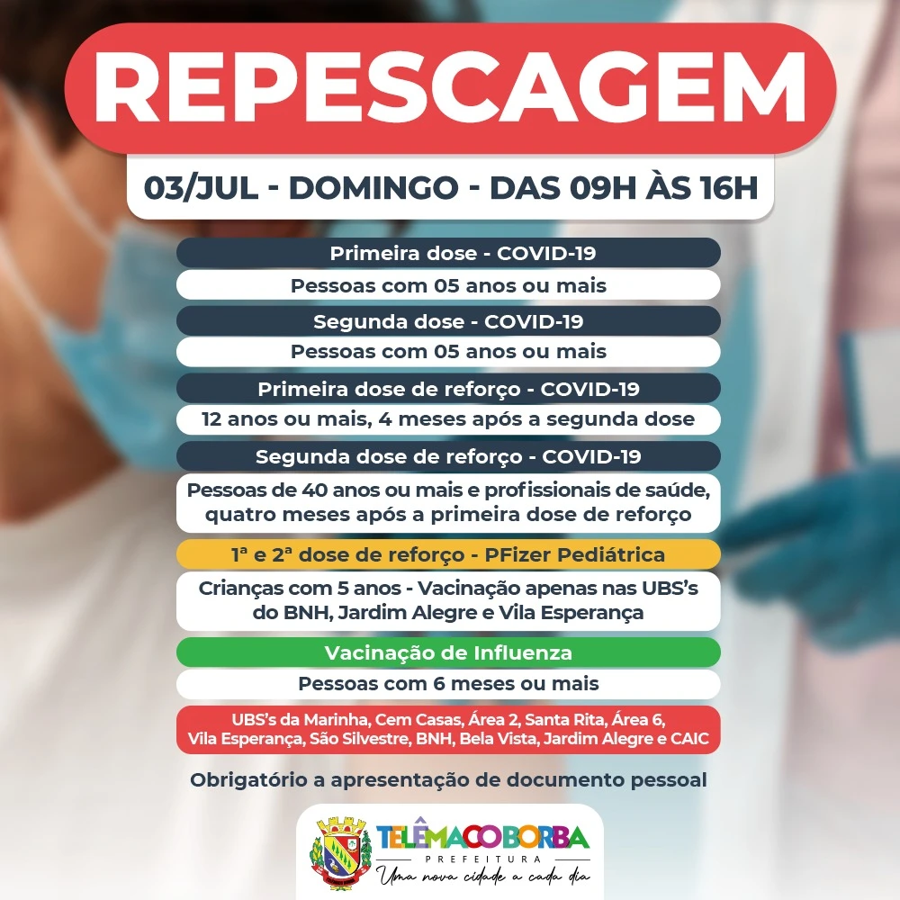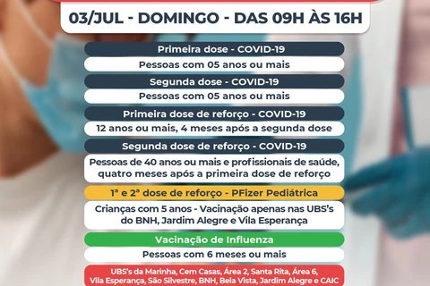COM ASSESSORIAS - As Unidades Básicas de Saúde (UBSs) da Área 2, Vila Esperança, Marinha, São Silvestre, BNH, Bela Vista, Cem Casas, Santa Rita, Caic e Área 6 estarão abertas, neste domingo (3), para repescagem da vacina contra a Covid-19 para pessoas com 40 anos ou mais e Influenza.