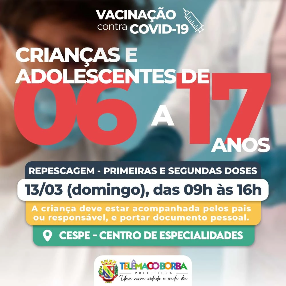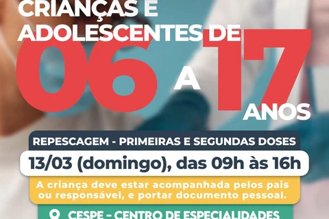 COM ASSESSORIAS - A Secretaria Municipal de Saúde realiza no domingo (13) uma repescagem para crianças de 06 a 11 anos que ainda não tomaram a primeira dose da vacina contra a Covid-19 também para as que estão no prazo para a segunda dose. A vacinação será feita das 09 às 16 horas no Centro de Especialidades (CESPE).