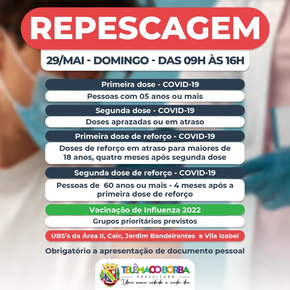 Na repescagem serão aplicadas todas as doses contra a Covid: primeira dose pendente; segunda dose aprazada ou pendente; dose de reforço para maiores de 18 anos que tenham recebido a segunda dose há quatro meses ou mais; e segunda dose de reforço para pessoas de 60 anos ou mais, que tenham recebido a dose de reforço há quatro meses ou mais.