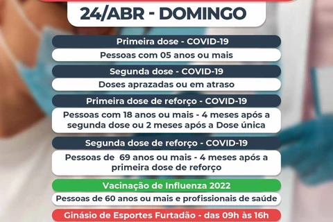 Serão primeiras doses para 05 anos ou mais; segundas doses aprazadas e em atraso; dose de reforço para 18 anos ou mais (04 meses após a segunda dose ou 02 meses após a dose única da Janssen) e segunda dose de reforço para pessoas de 69 anos ou mais (04 meses após a primeira dose de reforço - terceira dose).