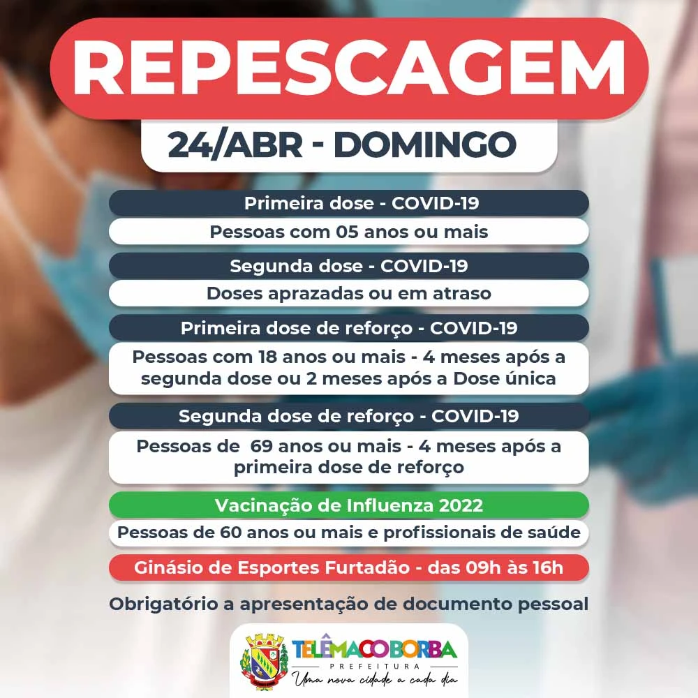 No dia da repescagem serão aplicadas primeiras, segundas, terceiras (dose de reforço) e quartas (segunda dose de reforço) doses contra a Covid-19. A SMS ressalta que no domingo iniciará a vacinação da quarta dose para pessoas com 69 anos ou mais.