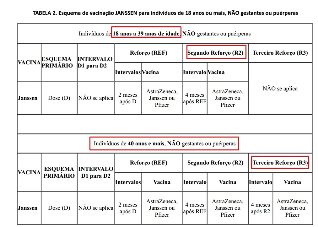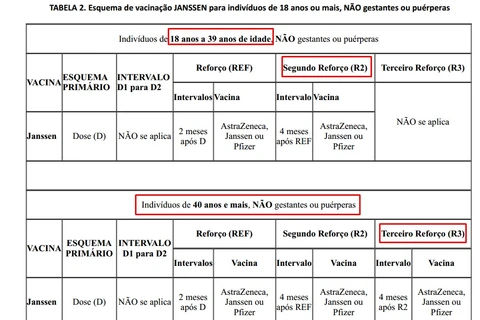 Para aqueles que receberam a vacina da Janssen como esquema inicial, o segundo reforço está liberado para quem tem 18 anos ou mais, quatro meses após o primeiro reforço e também o terceiro reforço para 40 anos ou mais, quatro meses após o segundo reforço.