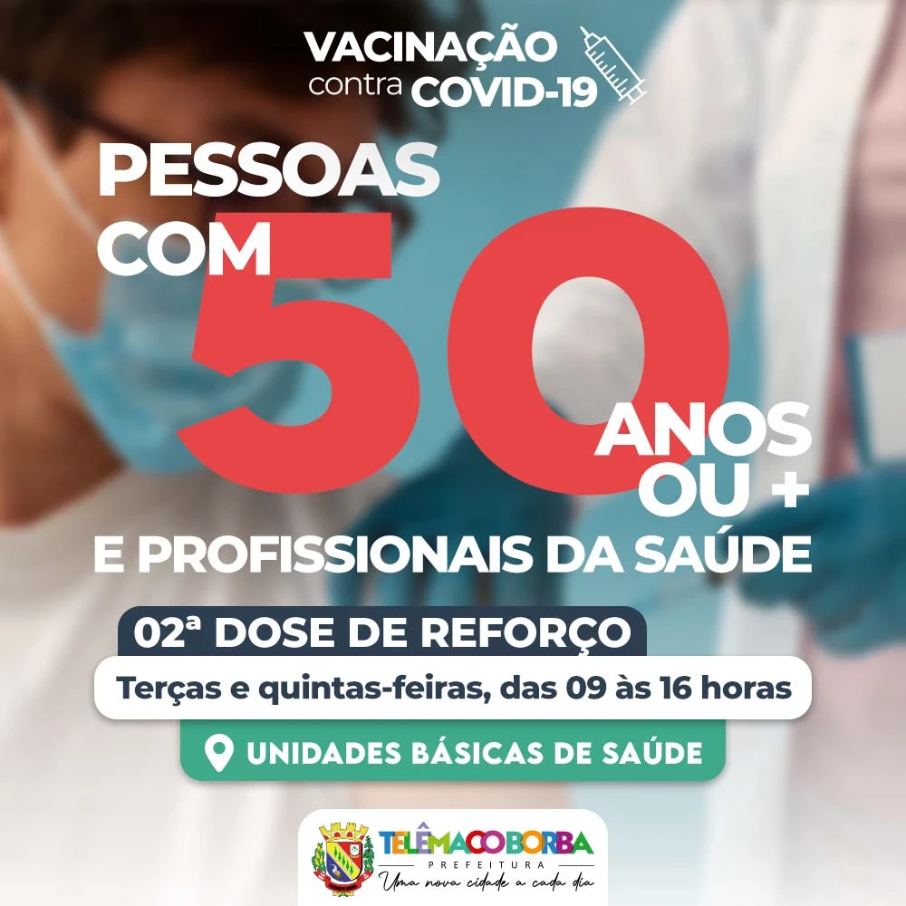 COM ASSESSORIAS - A Secretaria Municipal de Saúde (SMS) informa que será aplicada a segunda dose de reforço (quarta dose) da vacina contra a Covid-19 para pessoas com 50 anos ou mais e profissionais de saúde, desde que tenham tomado a primeira dose de reforço (terceira dose) há pelo menos quatro meses.