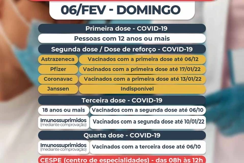 COM ASSESSORIAS - A Secretaria Municipal de Saúde (SMS) divulga o cronograma de vacinação para o domingo (06). As doses serão aplicadas no Centro de Especialidades (CESPE) das 8 às 12 horas. A primeira dose está programada para a população com 12 anos ou mais.