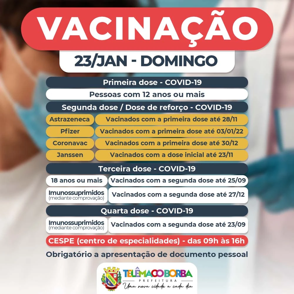 COM ASSESSORIAS - A Secretaria Municipal de Saúde (SMS) divulga o cronograma de vacinação para o domingo (23). As doses serão aplicadas no Centro de Especialidades (Cespe) das 9 às 16 horas. A primeira dose está programada para a população com 12 anos ou mais.