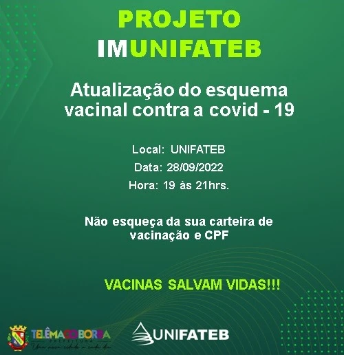 COM ASSESSORIAS - A Secretaria Municipal de Saúde (SMS), em parceria com a UniFateb, realiza na próxima quarta-feira (28), o Projeto ImUniFateb, que visa a atualização do esquema vacinal contra a Covid-19.