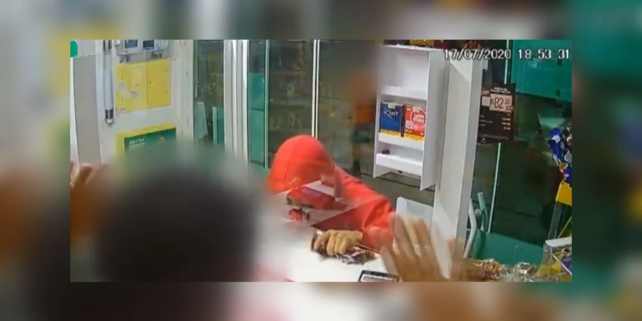 Nas imagens é possível ver que o atendente do caixa do posto estava terminando de atender um cliente, quando o homem, de moletom vermelho, se aproxima. Nesse momento, ele saca a arma da cintura, retira a corrente da porta e pede o dinheiro. Sem reagir, o atendente pega as notas na gaveta e entrega para o suspeito, que vai embora caminhando.