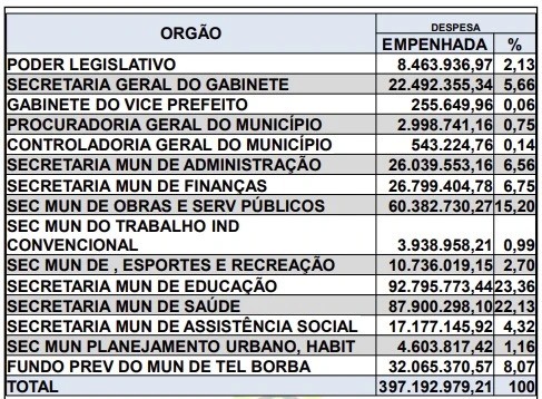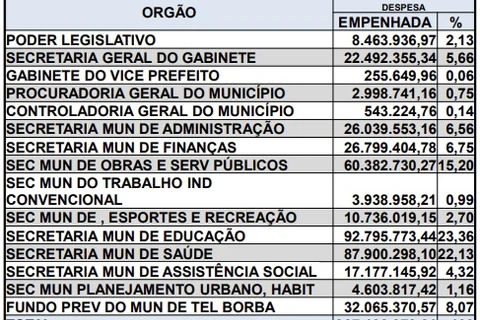 Esses três setores somaram R$ 241,07 milhões, o que corresponde a 60,69% da despesa empenhada.