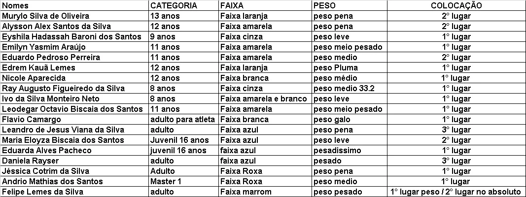 “Agradecimento à Administração Municipal, ao secretário de Esportes, Fabrício Flores e ao Anderson (Bello) por acreditarem no trabalho da nossa equipe de Jiu Jitsu. Lembrando que o Flávio Camargo é campeão na categoria Parajiu-jitsu”, declarou o treinador Jonilson.