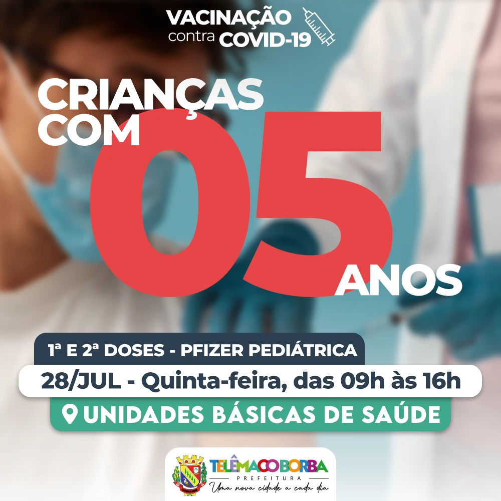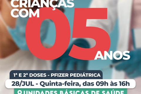 COM ASSESSORIAS - A Secretaria Municipal de Saúde informa que nesta quinta-feira (28), a vacinação com o imunizante Pfizer pediátrico estará disponível em todas as Unidades Básicas de Saúde (UBS), das 09 às 16 horas.