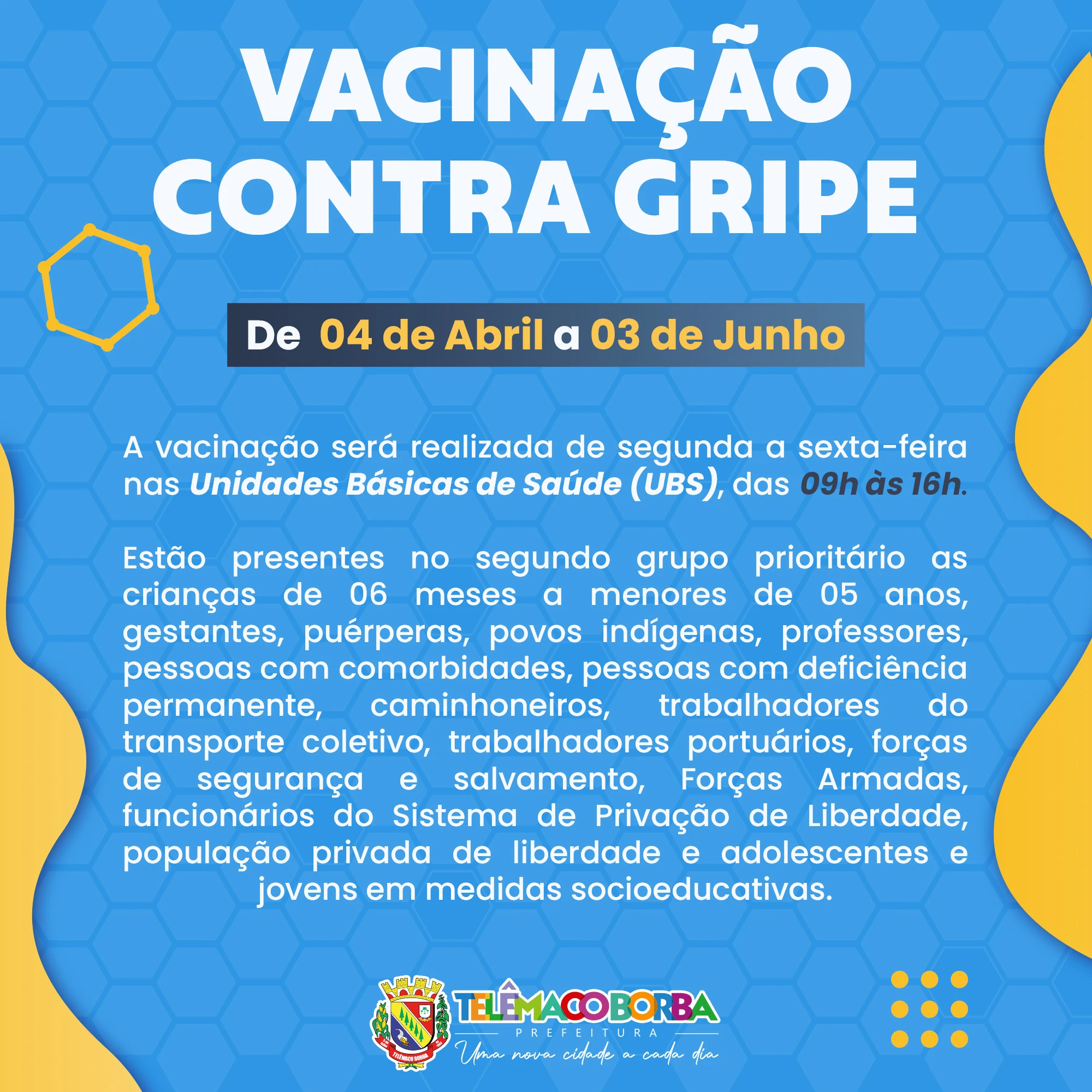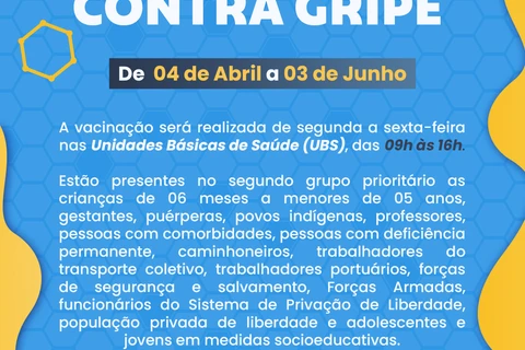 COM ASSESSORIAS - A Secretaria Municipal de Saúde (SMS) alerta para a vacinação contra a influenza (gripe). As pessoas com 60 anos ou mais e profissionais da saúde que ainda não se vacinaram e também o segundo grupo com prioridade para vacinação, podem se imunizar de segunda a sexta-feira, das 09 às 16 horas, na sua Unidade Básica de Saúde (UBS) de referência.