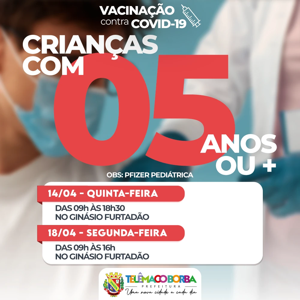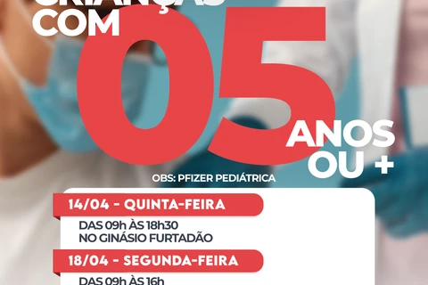 COM ASSESSORIAS - A Secretaria Municipal de Saúde (SMS) realiza na quinta-feira (14), das 09 às 18h30, no Ginásio Furtadão, a aplicação da vacina Pfizer Pediátrica contra a Covid-19, para primeira dose de crianças com 05 anos ou mais e segundas doses.