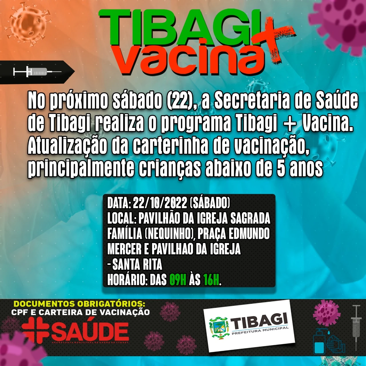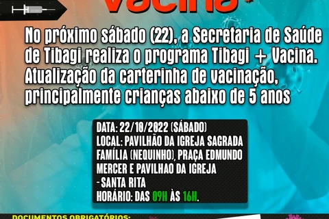 COM ASSESSORIAS - A Prefeitura de Tibagi, através da Secretaria de Saúde, informa que neste sábado (22) irá realizar mais uma ação do programa Tibagi + Vacina, que pretende imunizar o maior número de tibagianos possíveis.
