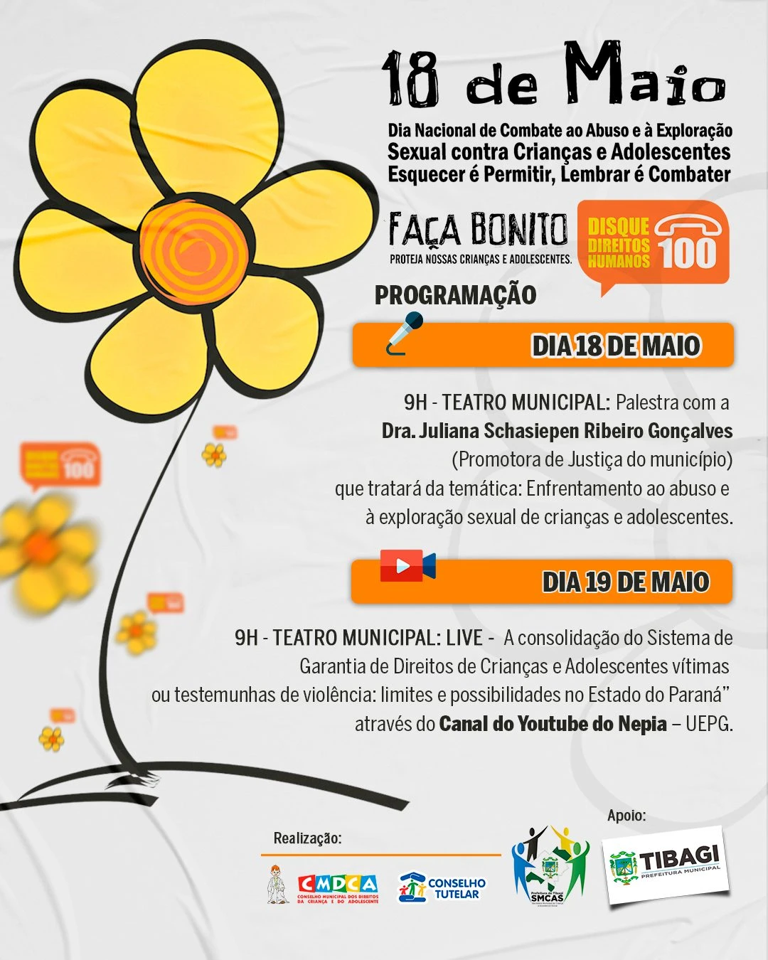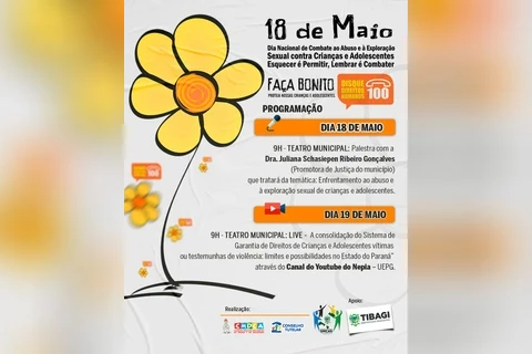 COM ASSESSORIAS - A Prefeitura Municipal de Tibagi, através da Secretaria da Criança e Assistência Social, promove nos dias 18 e 19 de maio um evento em alusão ao Dia Nacional de Combate ao Abuso e à Exploração Sexual Contra Crianças e Adolescentes. Através da campanha Faça Bonito, que tem por objetivo potencializar as ações no combate a esse tipo de exploração, o município também irá divulgar ações importantes e que conta com a participação de toda a comunidade através de denúncias no disque 100.