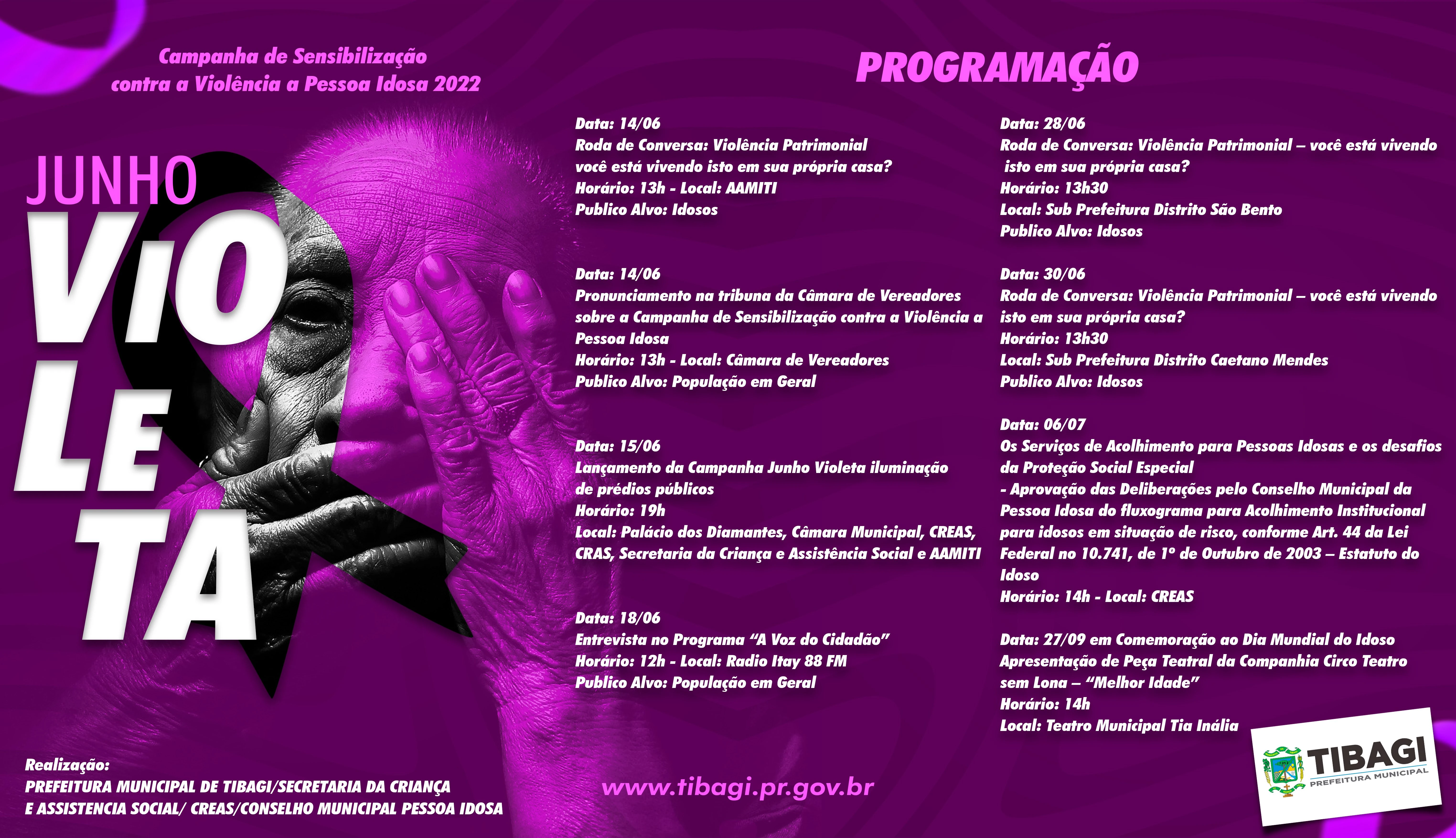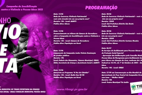 COM ASSESSORIAS - A Prefeitura de Tibagi, através da Secretaria da Criança e Assistência Social, realiza no decorrer do mês a campanha "Junho Violeta", que tem como objetivo sensibilizar a população contra a violência a pessoa idosa.