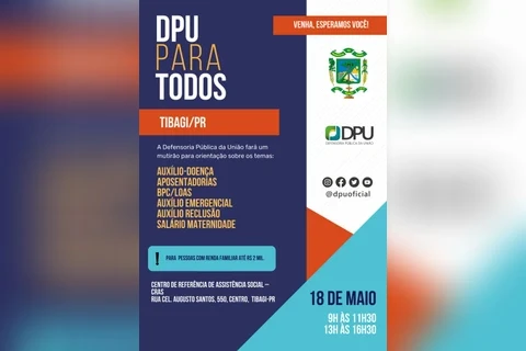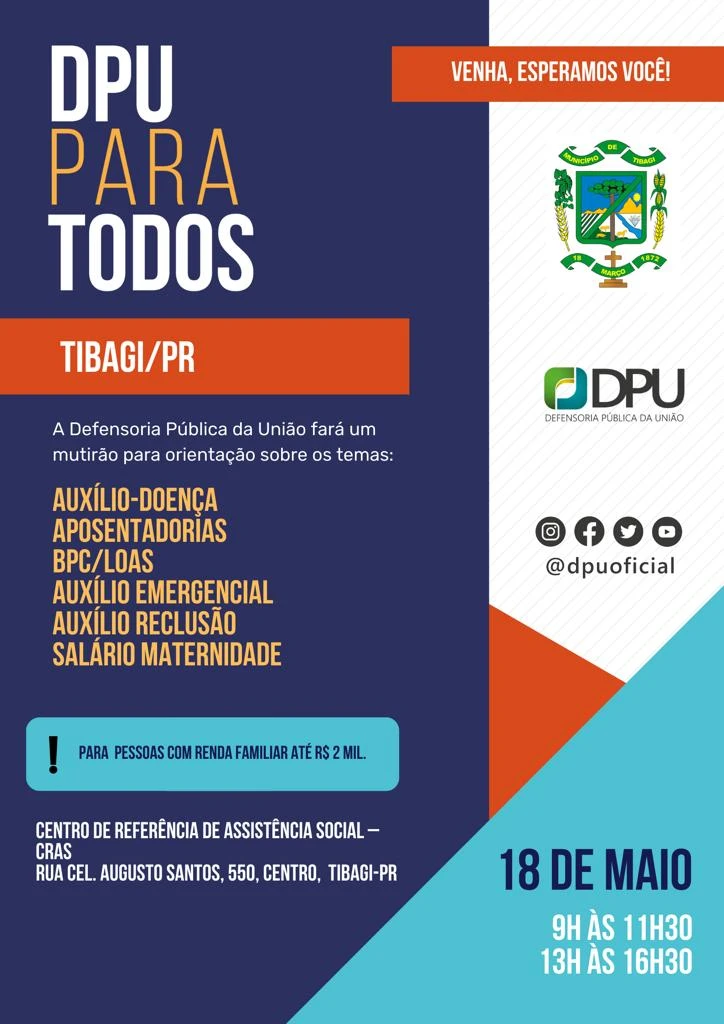 COM ASSESSORIAS - A Prefeitura de Tibagi, através da Secretaria da Criança e Assistência Social, realiza na próxima quinta-feira (18), no Centro de Referência da Assistência Social (CRAS), o evento DPU para Todos.