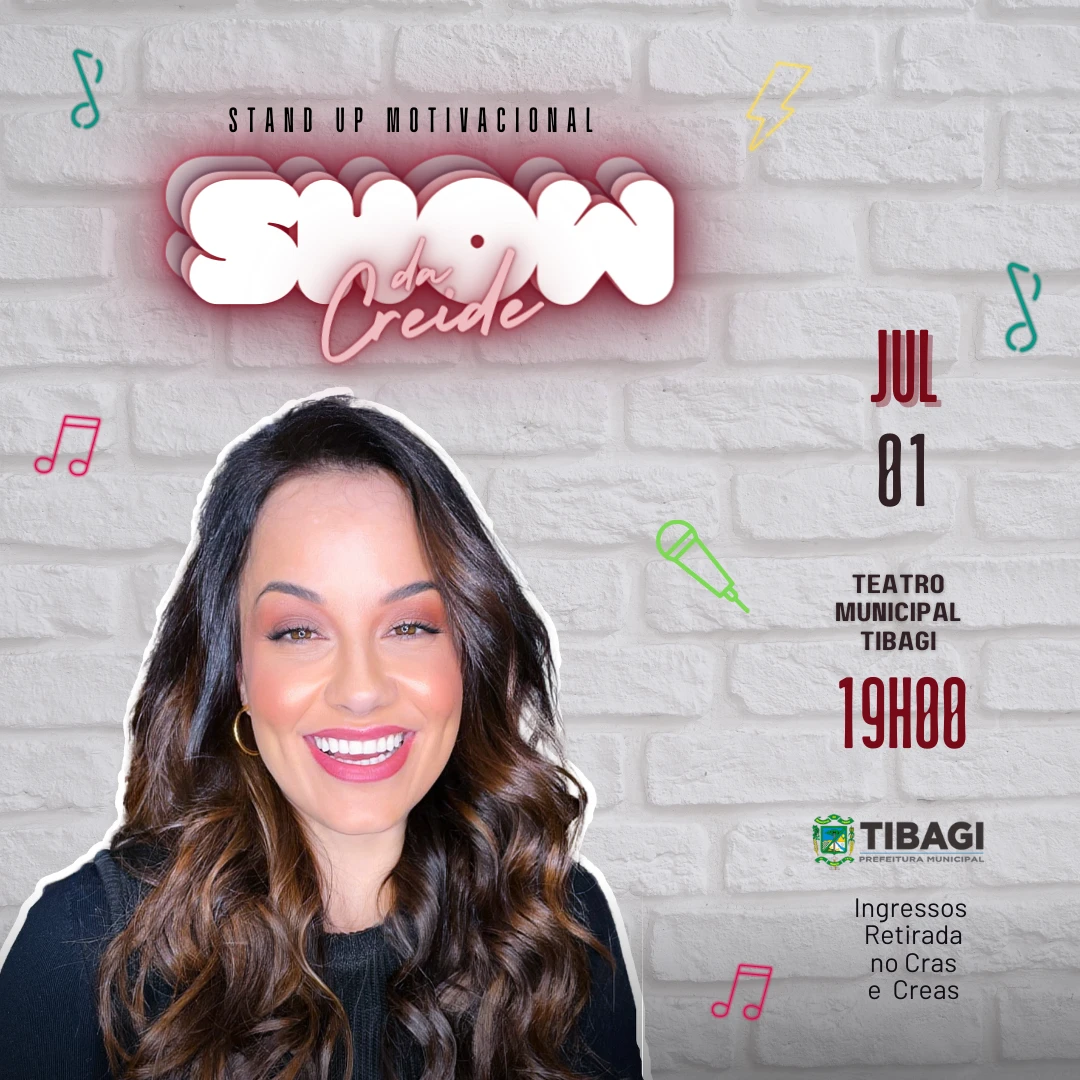 COM ASSESSORIAS - A Prefeitura de Tibagi, através da Secretaria da Criança e Assistência Social, realiza no dia 1º de julho (sexta-feira) no teatro Tia Inália um show de humor com a artista Creide, conhecida por realizar stand-up comedy e também um workshop de auto maquiagem.