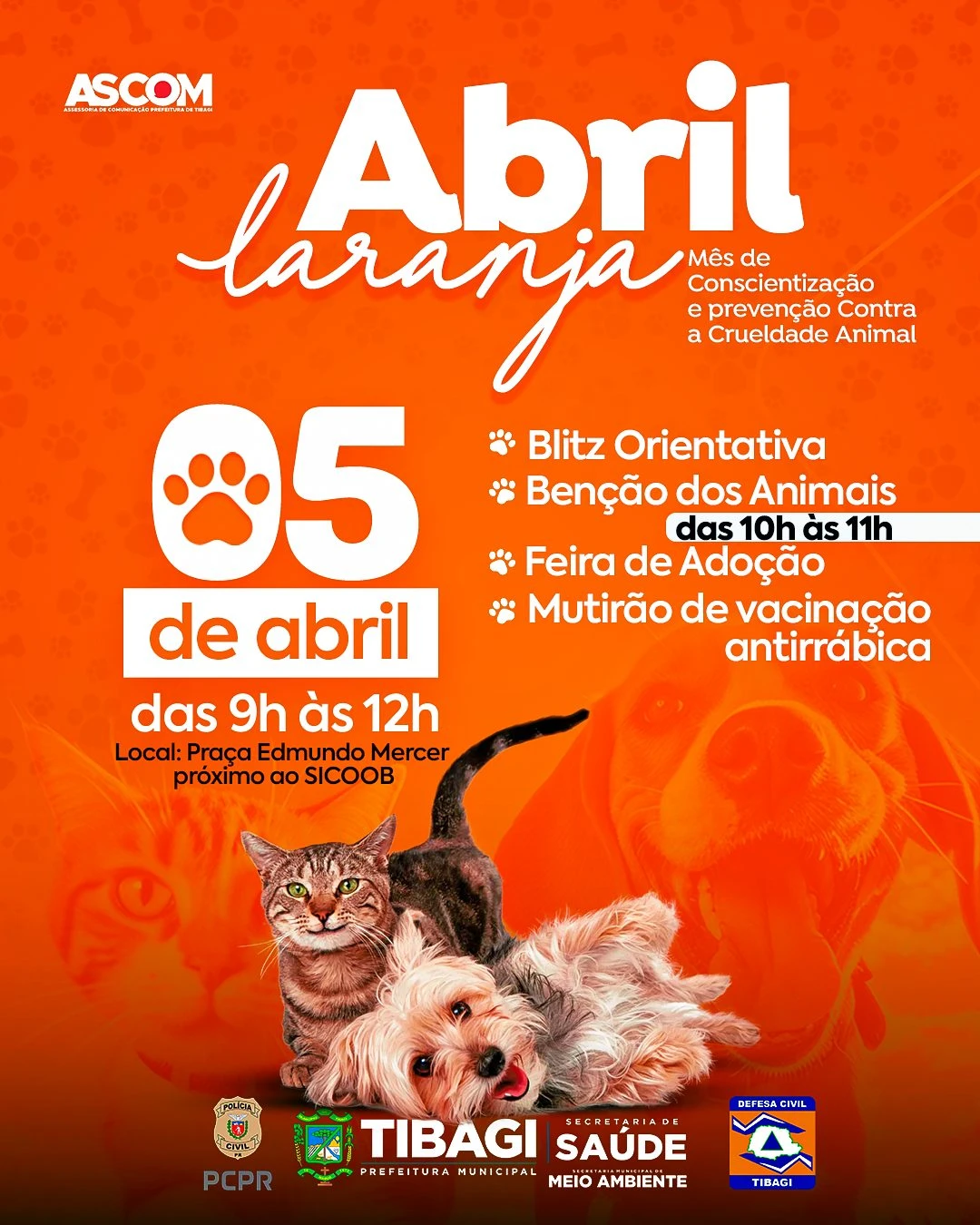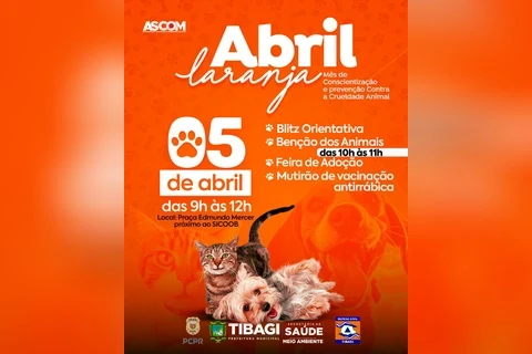 COM ASSESSORIAS - No sábado dia 5 de abril, a Prefeitura de Tibagi vai realizar a Blitz Abril Laranja, em alusão ao Mês de Conscientização Contra a Crueldade Animal. A ação acontece das 9h às 12h, na esquina da Praça Edmundo Mercer, e conta com a parceria da Secretaria de Saúde, Secretaria de Meio Ambiente, Defesa Civil, Polícia Civil e Igreja Católica.