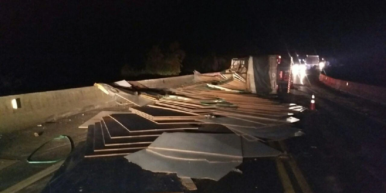 O motorista de um caminhão Volvo que transportava placas de MDF de Curitiba (PR) para Cuiabá (MT) perdeu o controle do veículo em uma curva, atingindo uma Pajero que vinha no sentido contrário da pista. Após o choque o caminhão tombou sobre a pista.