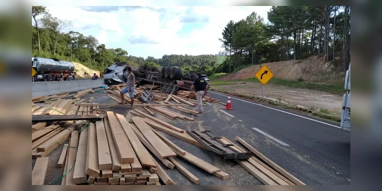 De acordo com a Polícia Rodoviária Federal (PRF), o motorista seguia de Imbaú para Ponta Grossa, nos Campos Gerais, quando perdeu o controle e tombou em uma curva. A carga do caminhão, composta por tábuas de madeira, ficou espalhada na pista, interditando a rodovia sentido Curitiba.