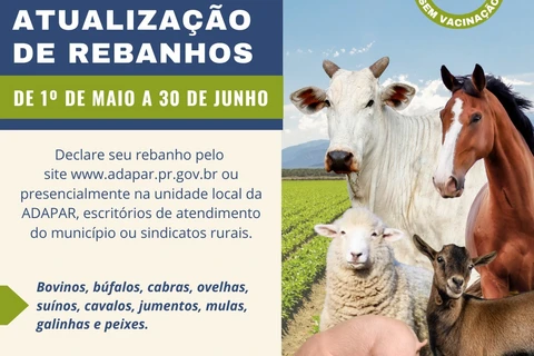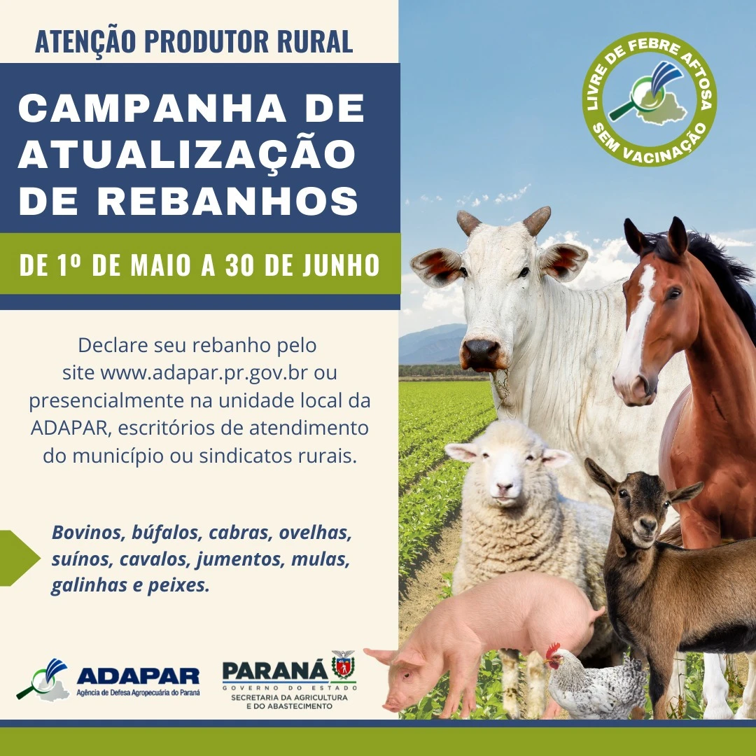 COM ASSESSORIAS - A campanha de atualização dos rebanhos do Paraná de 2023 vai até 30 de junho. A atualização é obrigatória para todos os produtores rurais com animais de produção de qualquer espécie sob sua guarda.