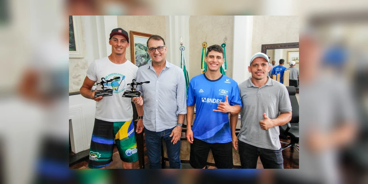 IMPRENSA/Tibagi - O prefeito Rildo Leonardi recebeu, na manhã desta sexta-feira (8), os canoístas André de Paula e Anderson Moura, que vieram apresentar as conquistas obtidas durante o Campeonato Brasileiro Canoagem Descida e Caiaque Extremo, disputado em Bonito, Mato Grosso do Sul, e no Sulamericano de Canoagem, disputado em Alumine, na Argentina, na semana passada. O secretário municipal de Esportes e Recreação Orientada, Edilson Fusca, também participou do encontro.
