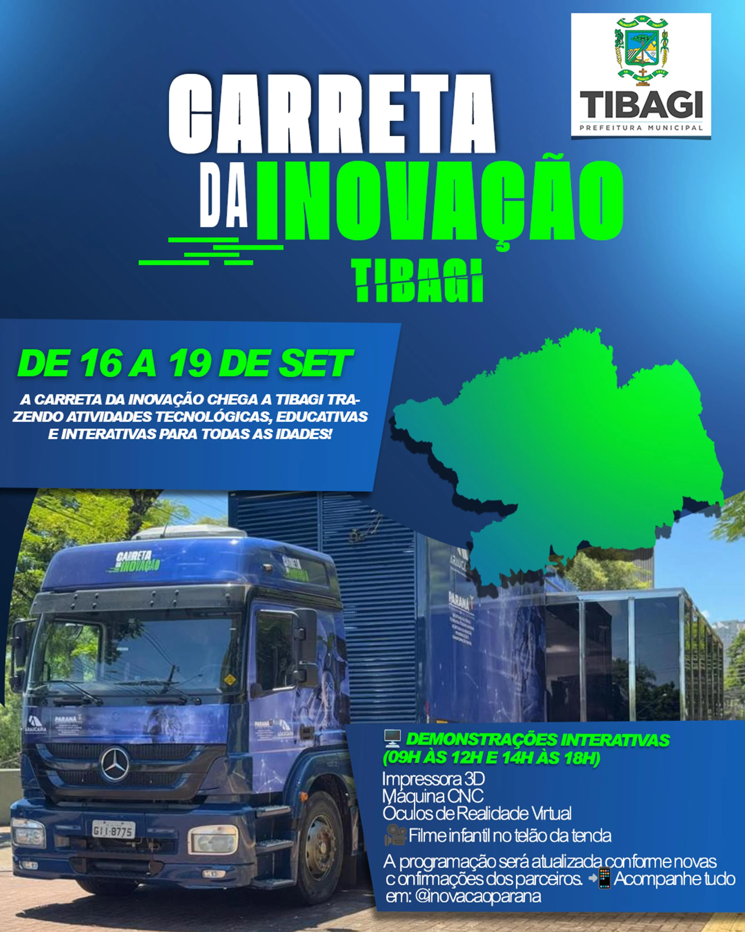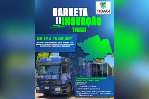 COM ASSESSORIAS - Nesta semana, Tibagi recebe as atividades de tecnologia, ciência, lazer e empreendedorismo da Carreta da Inovação. A ação é gratuita e acontece de terça-feira (16) a sexta-feira (19), das 9h às 12h e das 14h às 18h.