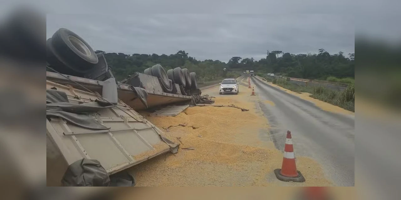 Uma carreta carregada com milho tombou na BR-376, em Tibagi, nos Campos Gerais do Paraná e a carga se espalhou na rodovia no sentido sul. O acidente aconteceu por volta das 22h30 de quinta-feira (21).