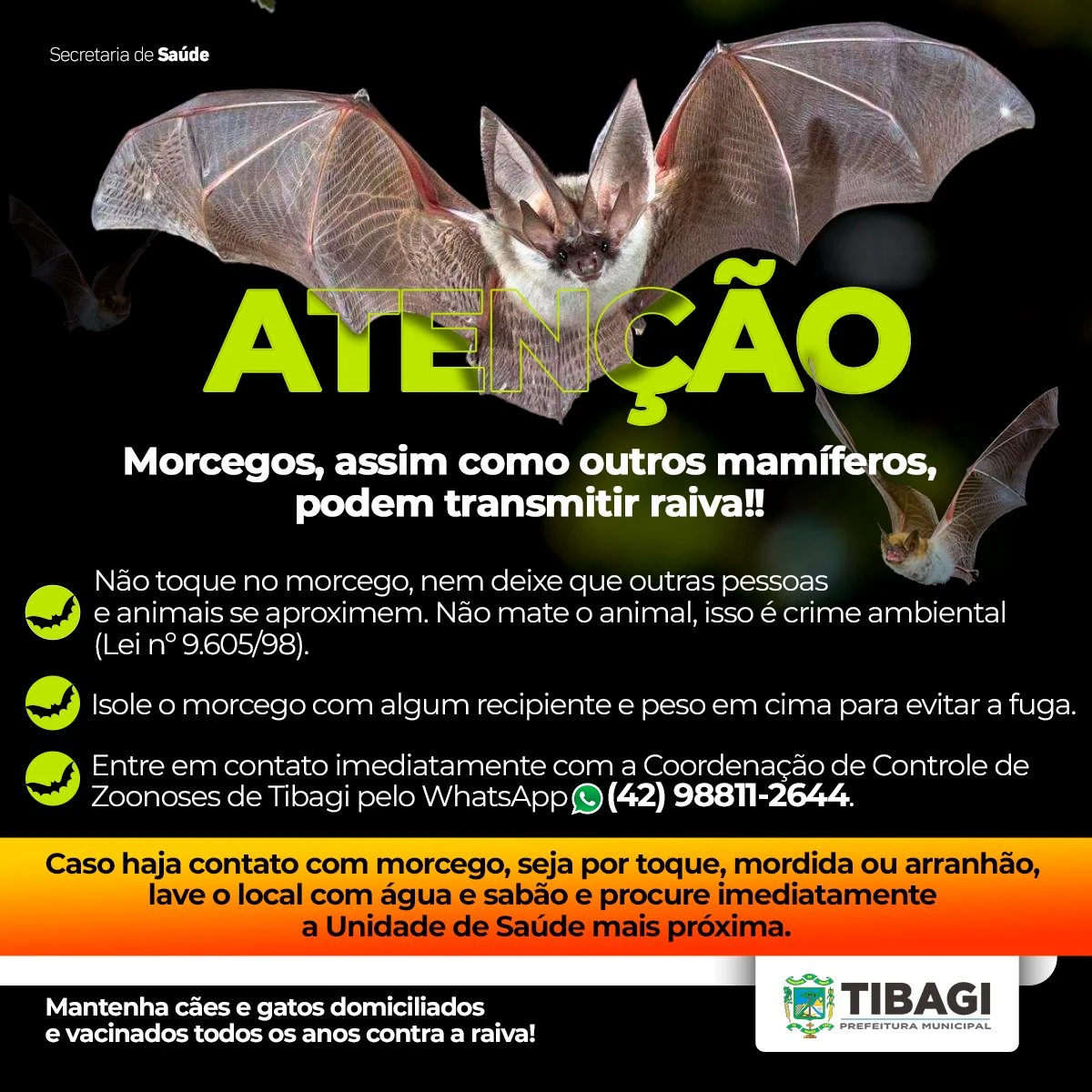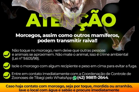 O médico veterinário Pedro Irineu Teider Junior, coordenador de Controle de Zoonoses, reforça a importância de que se alguém encontrar um morcego caído no chão, vivo ou morto, ou se o animal for avistado em atividade durante o dia, a recomendação é de não tocar no morcego e nem deixar que outras pessoas ou animais se aproximem, e entrar em contato com o Controle de Zoonoses (CCZ) do município pelo número (42) 98811-2644.