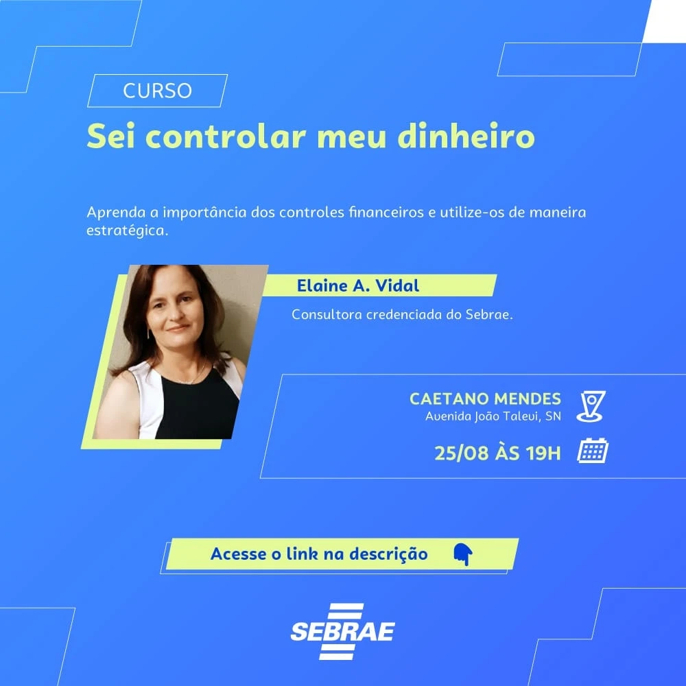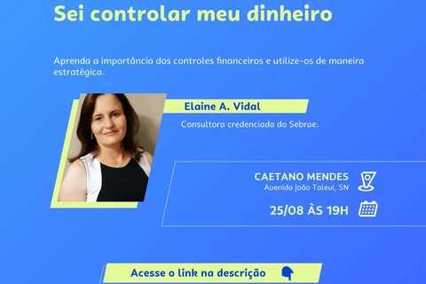 Na próxima quinta-feira (25), às 19h, na subprefeitura de Caetano Mendes, que fica na Avenida João Talevi, s/n, a consultora credenciada do Sebrae Elaine A. Vidal irá promover a oficina “Sei controlar o meu dinheiro”, com foco na gestão financeira dos negócios.