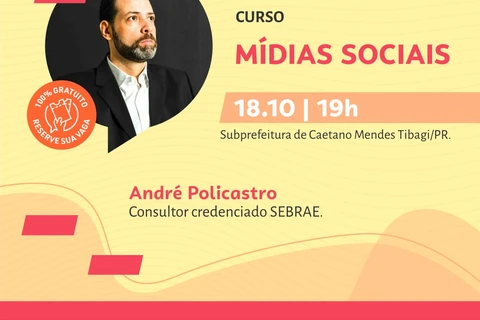 No dia 18 de outubro (próxima quarta-feira), na subprefeitura de Caetano Mendes às 19h, o consultor André Policastro irá trabalhar a importância das mídias sociais para que o negócio dos empreendedores tibagianos alcancem a excelência nos seus negócios.
