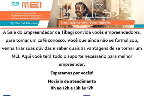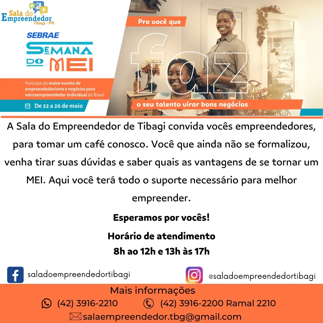 COM ASSESSORIAS - A Prefeitura de Tibagi, através da Secretaria de Desenvolvimento, Indústria, Comércio e Trabalho, promove dos dias 22 a 26 de maio a Semana do MEI, evento realizado em diversas cidades do Brasil para fortalecer a atuação dos microempreendedores individuais nos municípios.
