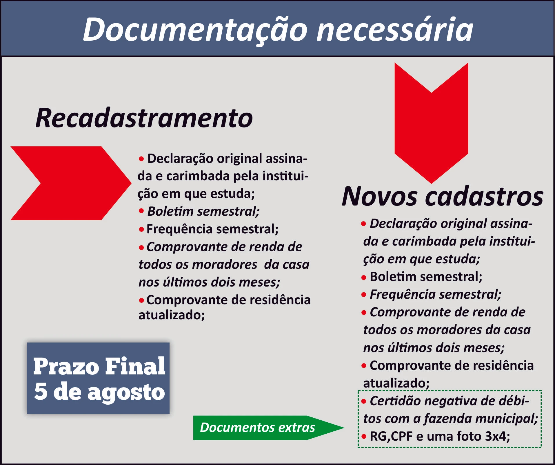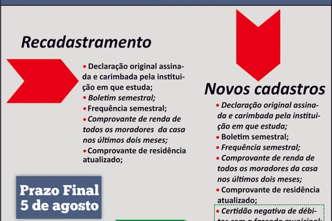 Estudantes já cadastrados devem procurar a Secretaria Municipal de Educação e Cultura (Semec) com declaração original assinada e carimbada pela instituição em que estuda, boletim semestral, frequência semestral, comprovante de renda de todos os moradores nos últimos dois meses e um comprovante de residência atualizado.