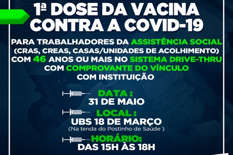 COM ASSESSORIAS - A Secretaria de Saúde de Tibagi, através do Governo do Estado do Paraná, conseguiu a liberação na manhã desta segunda-feira (31) para dar início à vacinação dos trabalhadores que atuam na Assistência Social. Para não perder tempo, começa hoje mesmo a imunização dos profissionais de 46 anos ou mais na modalidade drive thru na UBS 18 de Março das 15h às 18h.