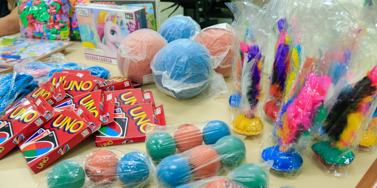 Dentre os materiais adquiridos estão kits psicmotrocidade, quebra-cabeças de 50 e 100 peças, bolas de borracha, jogos de petecas, cordas de nylon, blocos de montar de 500 peças, tatames infantis, letras em EVA, bolas grandes e pisos emborrachados.
