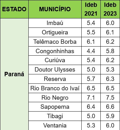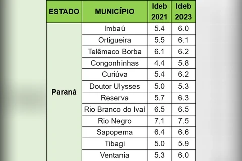 COM ASSESSORIAS - O programa Klabin Semeando Educação, que capacita gestores e professores do ensino fundamental das escolas públicas, contribuiu para o aumento do Ideb (Índice de Desenvolvimento da Educação Básica) em 11 dos 12 municípios onde é realizado no Paraná. Houve melhoria nas cidades de Congonhinhas, Curiúva, Doutor Ulysses, Imbaú, Ortigueira, Reserva, Rio Negro, Sapopema, Telêmaco Borba, Tibagi e Ventania. O município de Rio Branco do Ivaí manteve a média em relação ao levantamento anterior, realizado em 2021.