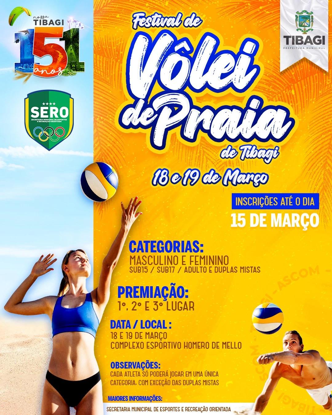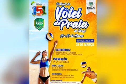 COM ASSESSORIAS - A Prefeitura de Tibagi, através da Secretaria de Esporte e Recreação Orientada (SERO), abre nesta segunda-feira (06) as inscrições para o Festival de Vôlei de Praia 2023. O evento esportivo faz parte das comemorações do aniversário de 151 anos de emancipação política do município.