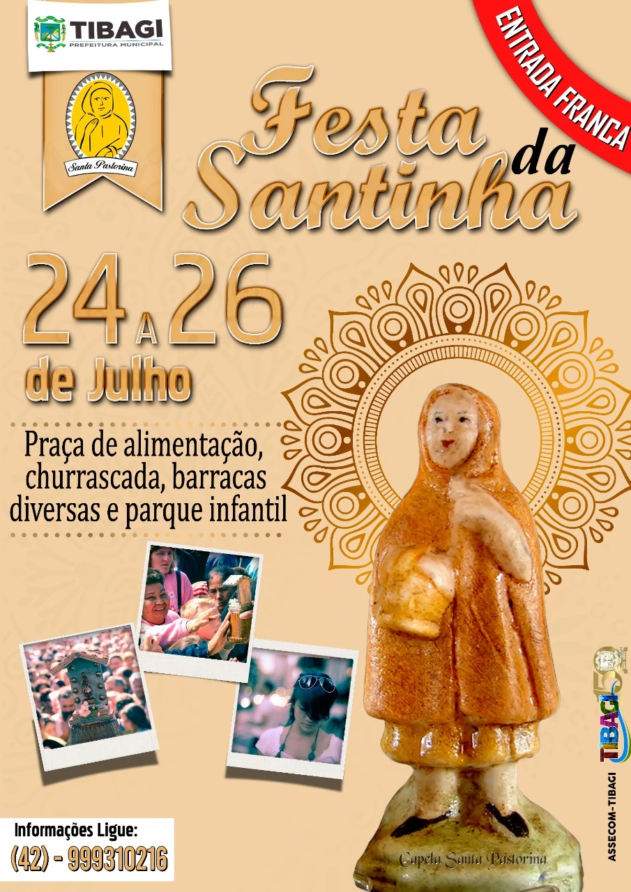 COM ASSESSORIAS - A Prefeitura de Tibagi informa que a tradicional festa religiosa da Santinha, ou Santa Pastorinha, já definiu sua programação para o ano de 2022. Ela será realizada em três dias, do dia 24 de julho (domingo) até 26 de julho (terça-feira), data em que é comemorado o dia da Santinha.