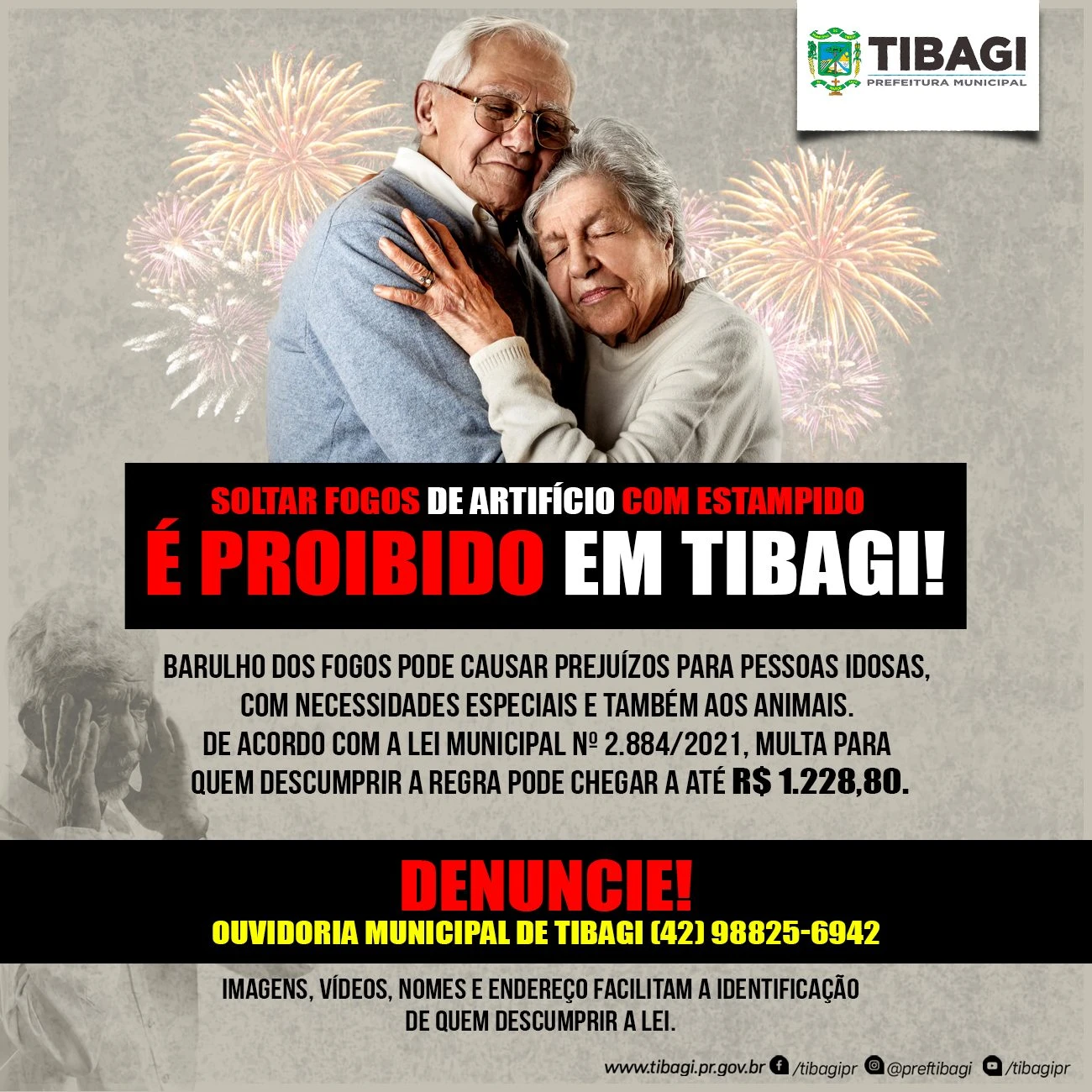 COM ASSESSORIAS - A Prefeitura de Tibagi informa que a Lei Municipal nº 2.884/2021 proíbe a queima, soltura e manuseio de fogos de artifício e artefatos pirotécnicos de alto impacto ou com efeitos de tiro.