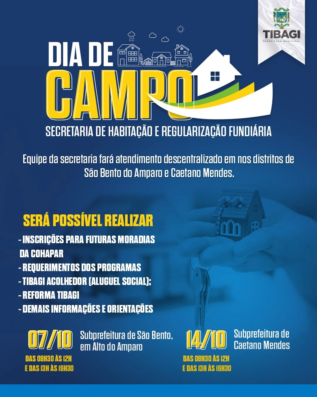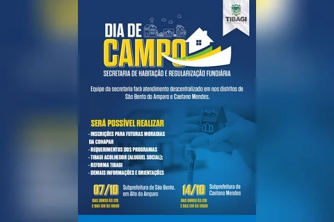 COM ASSESSORIAS - A Prefeitura de Tibagi, através da Secretaria de Habitação e Regularização Fundiária, realiza nas próximas duas semanas ações descentralizadas de atendimento das equipes nos distritos de Alto do Amparo/São Bento e Caetano Mendes.